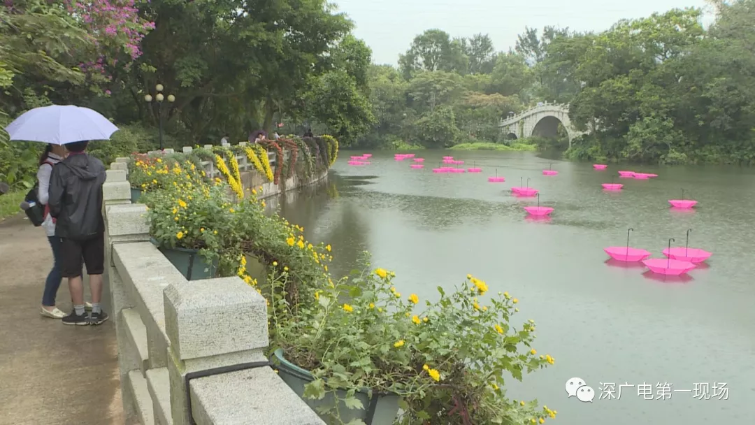 為了讓市民感受到這種小別重逢的驚喜,公園方面準備了很多新的創(chuàng)意,在沿湖步道布置了400盆懸崖菊,像孔雀尾羽一般垂向水面,湖面上三三兩兩漂浮著粉紅色的雨傘,在雨絲中倒映著湖光山色,別有一番詩情畫意。
