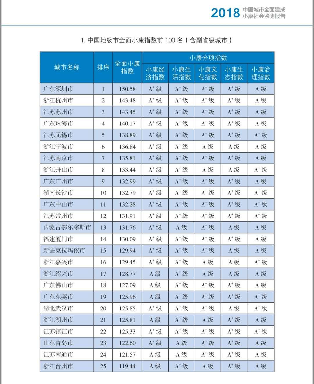 其中,深圳全面小康指數(shù)達150.58分,位列全國地級市(含副省級城市)全面小康指數(shù)前100名榜首。在分項指標中,深圳的小康經(jīng)濟指數(shù)、小康生活指數(shù)、小康文化指數(shù)、小康生態(tài)指數(shù)均達到A+級,小康治理指數(shù)為A級。