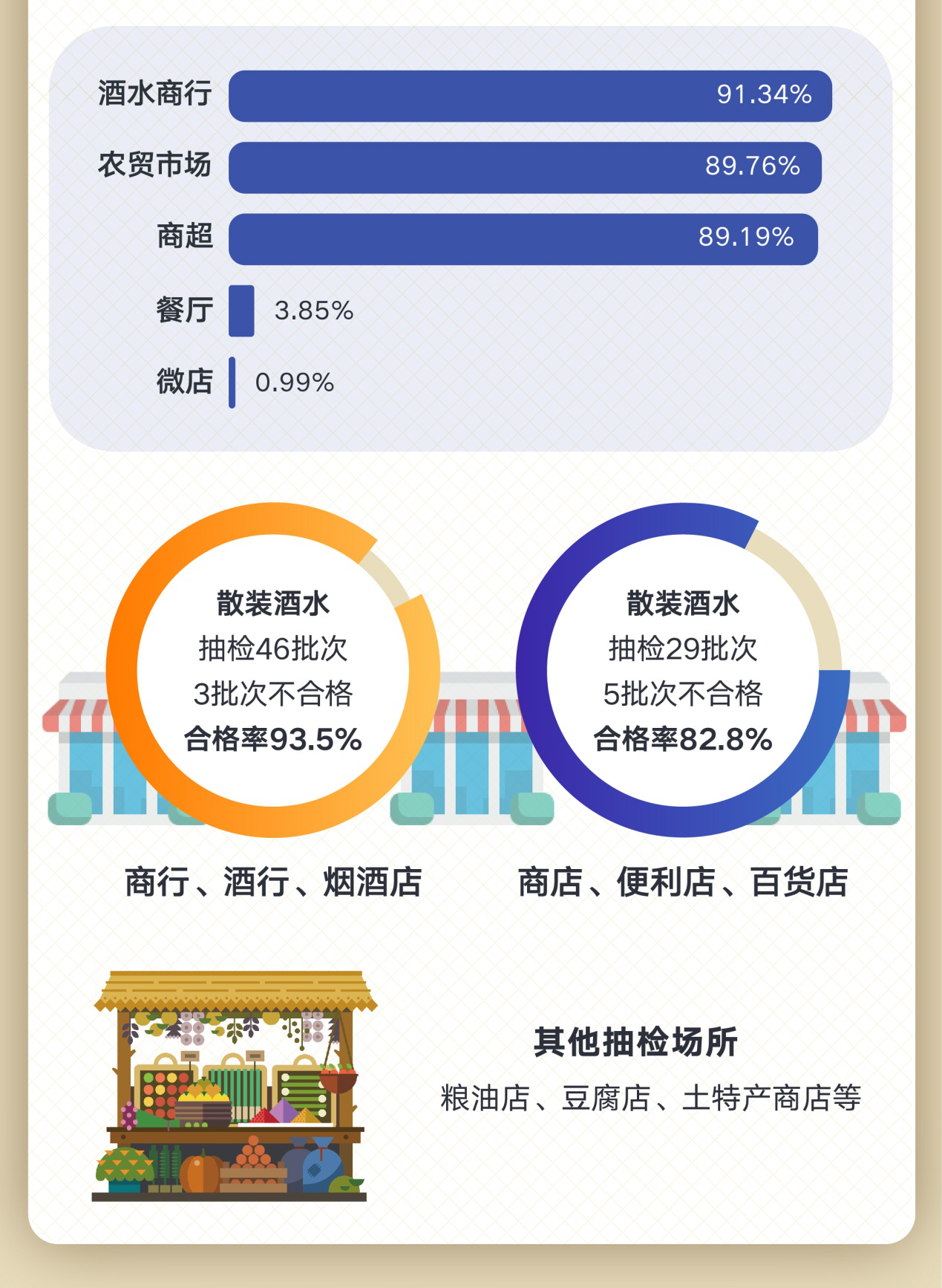 根據(jù)調(diào)查結(jié)果,此次共抽檢商行、酒行、煙酒店散裝酒水46批次,3批次不合格,合格率93.5%;抽檢商店、便利店、百貨店散裝酒29批次,5批次不合格,合格率82.8%。其他抽檢的散裝酒場(chǎng)所還有糧油店、豆腐店、土特產(chǎn)商店等。