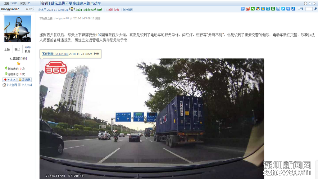 深圳新聞網(wǎng)11月28日訊(記者 劉婷)“電動車闖紅燈、逆行、搶道等‘無所不能'。”近日,深圳論壇網(wǎng)友“zhongyuan87”發(fā)帖吐槽電動車在107國道、西鄉(xiāng)大道無視交通規(guī)則肆意駕駛,擾亂正常秩序。(網(wǎng)帖:https://szbbs.sznews.com/thread-3824524-1-1.html)