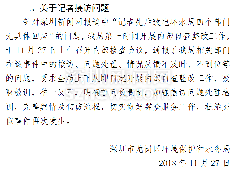 此外,對(duì)于前期報(bào)道中記者所提及的“先后致電四個(gè)部門均無具體回復(fù)”的情況,龍崗區(qū)環(huán)水局也給予了回應(yīng)。他們表示將在日后的工作中完善輿情和信訪流程,切實(shí)做好群眾服務(wù)工作。