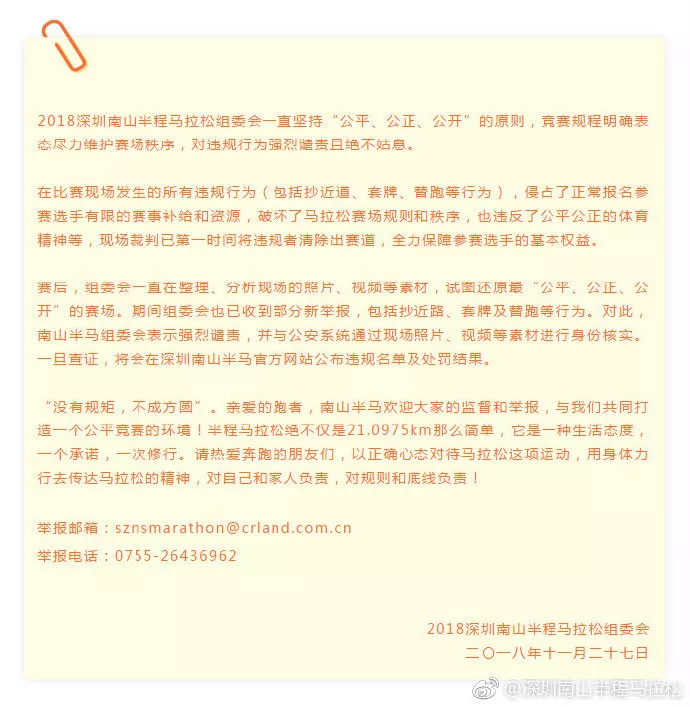 https://mp.weixin.qq.com/s/xge5TY29hk9IjLRMCAG43w希望廣大跑者遵守賽事規(guī)程,尊重其他正常參賽的跑者,尊重體育精神,自覺(jué)維護(hù)賽場(chǎng)秩序;深圳南山半程馬拉松組委會(huì)將在今后賽事中加強(qiáng)賽事監(jiān)督管理并融入技術(shù)手段,以跑者體驗(yàn)至上,共同營(yíng)造健康、公正、公平的馬拉松參賽環(huán)境。