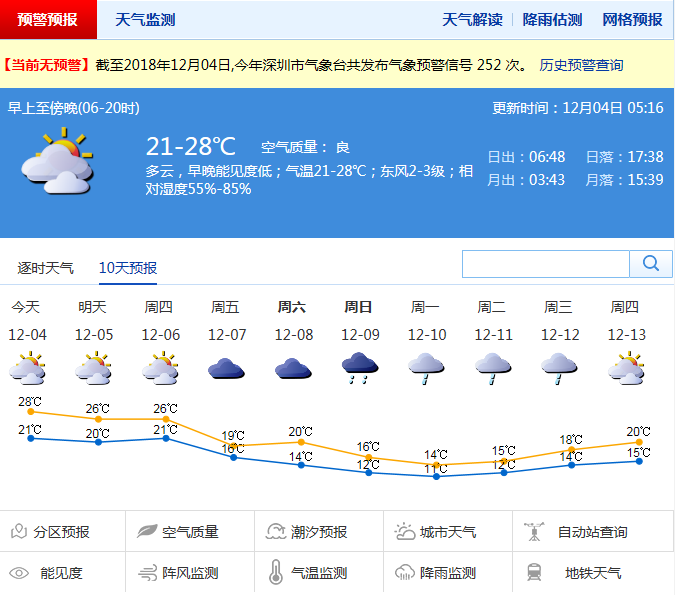 深圳新聞網(wǎng)12月4日訊(記者 劉婷)記者從市氣象臺獲悉,預計今日多云,午后云量增多,早晚有輕霧,氣溫21℃至28℃;5日至6日陰天間多云,間有零星小雨。預計7日起冷空氣活動頻繁,北風加大,7日至8日陰天有分散小雨,氣溫下降,最低氣溫或低至14℃。