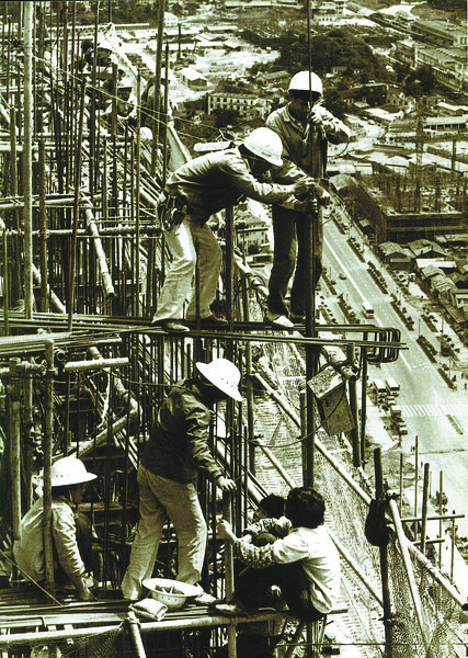 1984年,創(chuàng)造“三天一層樓”的“深圳速度”的國貿大廈工人。江式高 攝