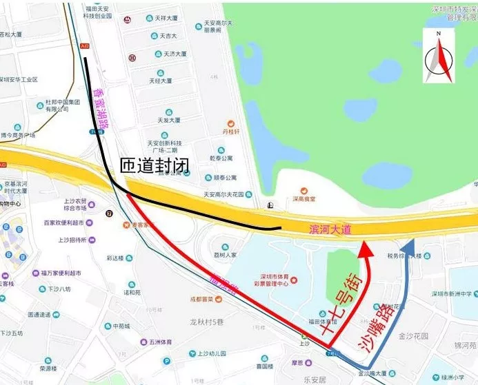 片區(qū)繞行:原經(jīng)香蜜湖路輔道往濱河大道東行的車輛,可沿香蜜湖路繼續(xù)前行至十七號(hào)街和沙嘴路左轉(zhuǎn)進(jìn)入濱河大道。
