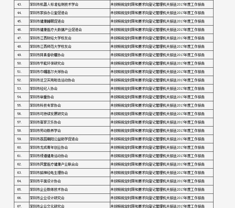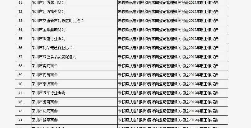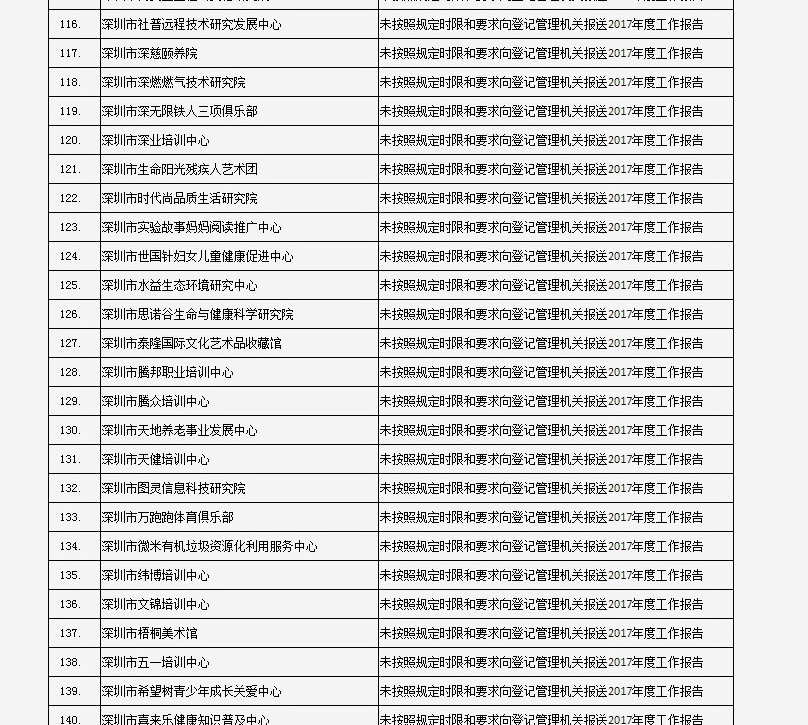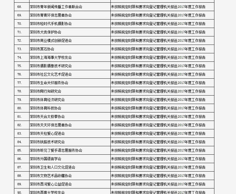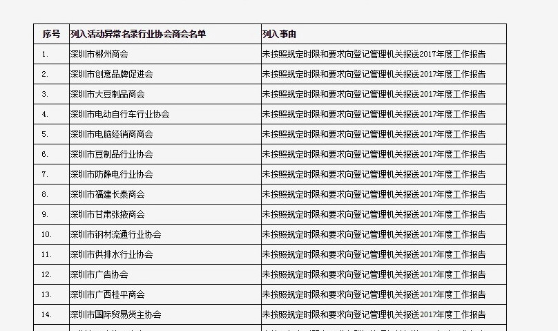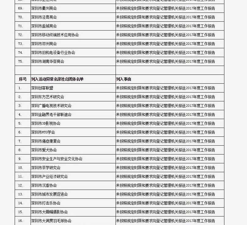 據(jù)深圳市民政局通報,深圳市華中科技大學(xué)校友會和深圳市深圳大學(xué)校友會等121家社會團(tuán)體、深圳市郴州商會等75家行業(yè)協(xié)會商會、企業(yè)家與企業(yè)管理研究院(中國·深圳)等201家民辦非企業(yè)單位、深圳市明園慈善基金會等20家基金會,經(jīng)查“未按照規(guī)定時限和要求向登記管理機(jī)關(guān)報送2017年度工作報告”,違反了《社會組織信用信息管理辦法》《深圳經(jīng)濟(jì)特區(qū)行業(yè)協(xié)會條例》的相關(guān)規(guī)定,被列入活動異常名錄名單。完整版名單已在“深圳民政在線”公布。