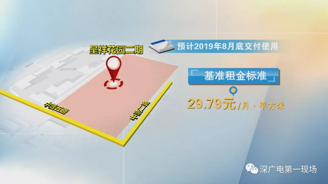 呈祥花園二期位于龍崗區(qū)坂田街道,中浩二路與中浩五路的交接處,預計2019年8月底交付使用。項目共有5棟住房,基準租金標準暫定為每月每平方米29塊7毛9。