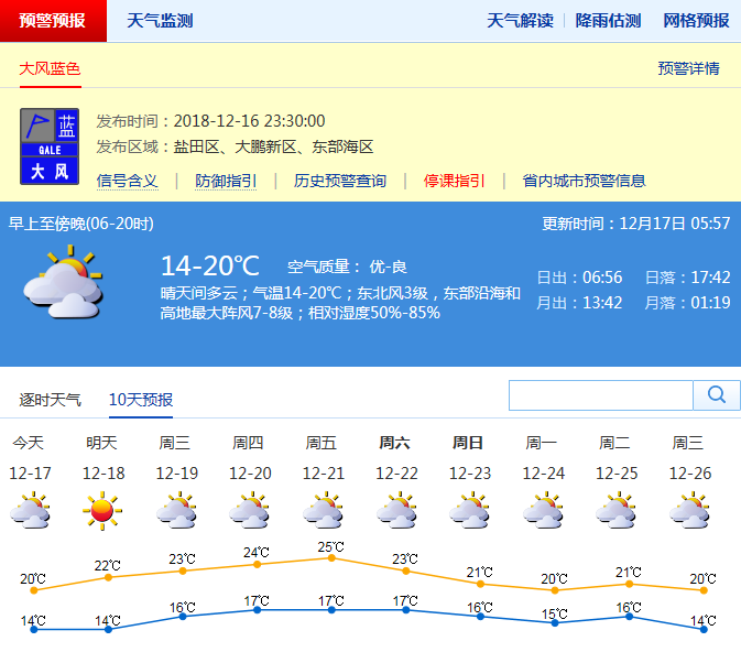 受冷空氣影響,近來(lái)深圳氣溫下降,本周前期冷空氣持續(xù)影響,17日~18日深圳晴天間多云,早晚清涼,白天溫暖,空氣干燥。其中17日北風(fēng)較大,沿海和高地最大陣風(fēng)6級(jí)~7級(jí),氣溫14℃~19℃。