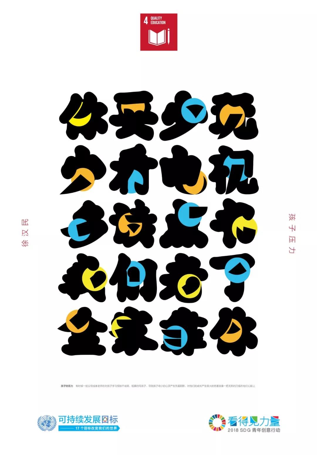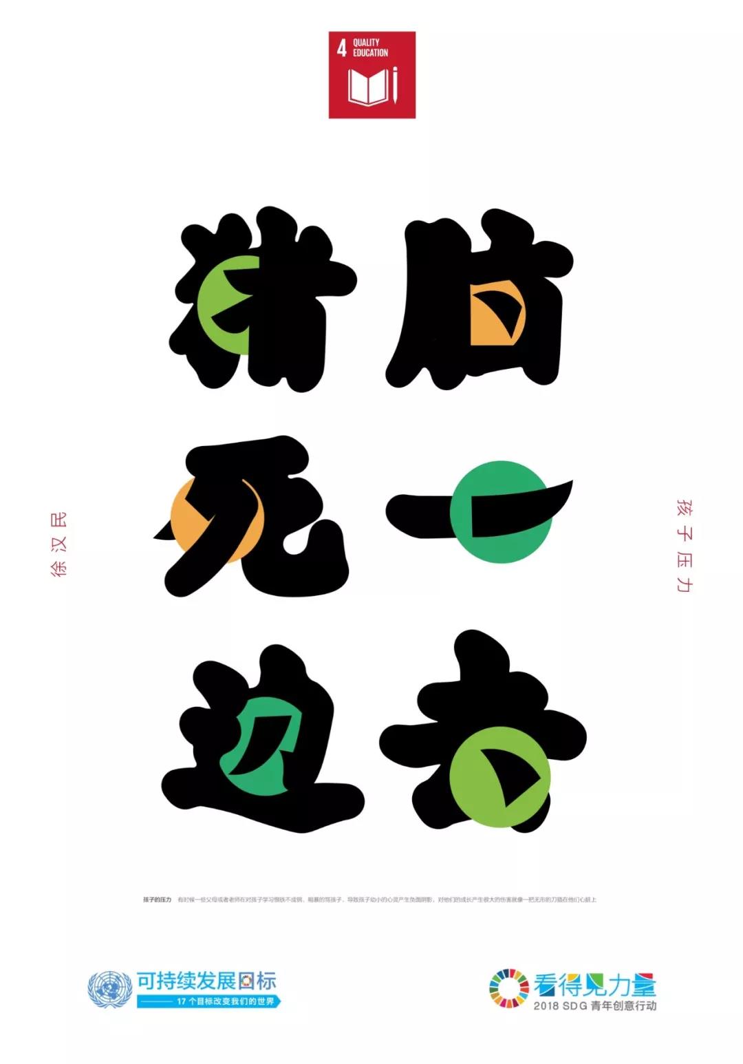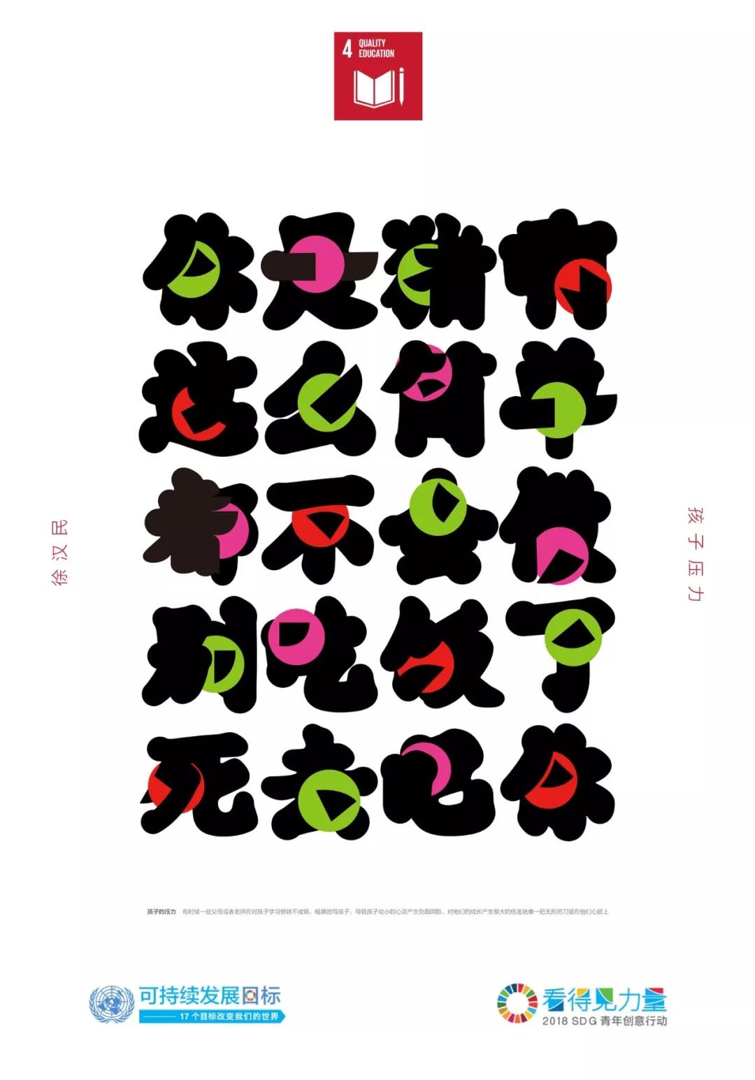 作品解釋 /現在孩子的壓力越來越大,導致很多孩子心理灰暗、暴力犯罪、自我封閉等現象,其中一個原因是父母期望和恨鐵不成鋼打罵給孩子帶來沉重的壓力。由此作者直接用那些語句來設計,這些字體中穿插著一個小圓點即孩子們的腦袋,他們被這些語言帶來的無形壓力刺痛,整個字比較圓潤只有關鍵的地方鋒利無比,就像一把無形的刀插在他們心上。