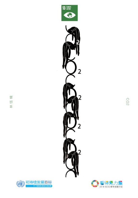 作品解釋 /海報的內容是CO2形狀的繩索將人類吊起窒息而死的畫面以此呼吁人類重視二氧化碳問題帶來的危害。