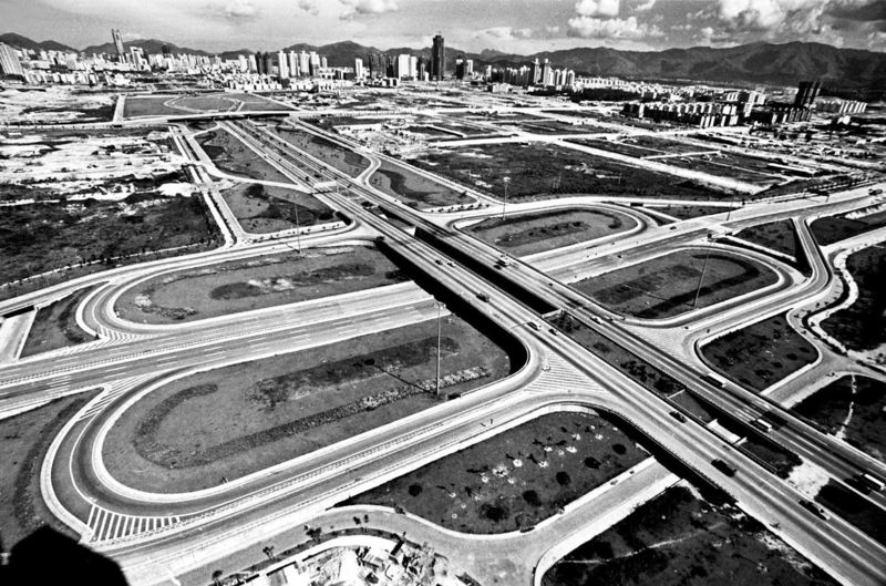 1992年,中心區(qū)“四橋一廣場”進入緊張施工,圖為金田立交橋的施工情景,背景是蓮花山。馬樹華攝