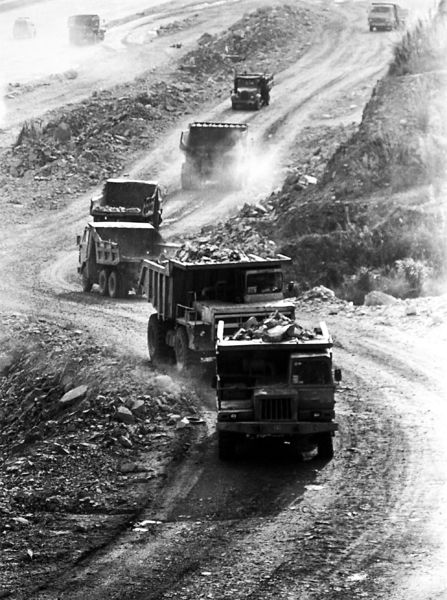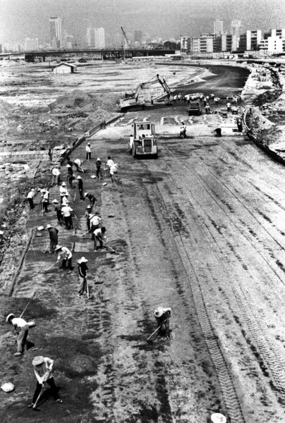 1994年修建濱海大道時泥頭車運泥填海。鄭東升攝