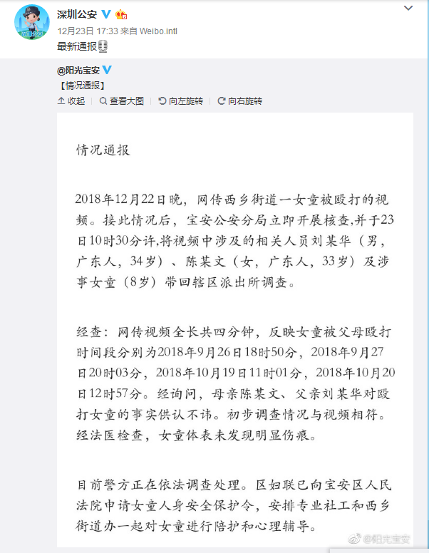 8歲女童遭家暴事件最新消息是,深圳警方對此展開了調查處理。寶安區(qū)婦聯(lián)已向寶安區(qū)人民法院申請女童人身安全保護令。寶安公安局的調查結果顯示,網(wǎng)上流傳的3分鐘視頻分別是今年9月、10月的四個時間段拍攝,女童父母對毆打女兒的事實供認不諱,法醫(yī)檢查女童體表未發(fā)現(xiàn)明顯傷痕。