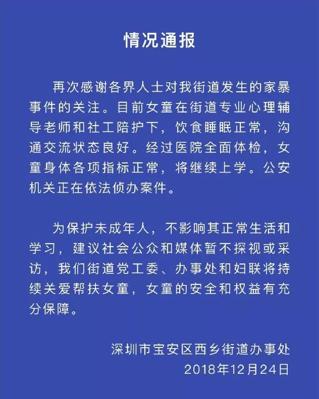 12月23日,深圳警方關(guān)注并調(diào)查此事。隨后深圳市寶安區(qū)委宣傳部官方微博@陽光寶安發(fā)布通報稱,女童父母對毆打女童的事實供認不諱。寶安區(qū)婦聯(lián)已向法院申請女童人身安全保護令。