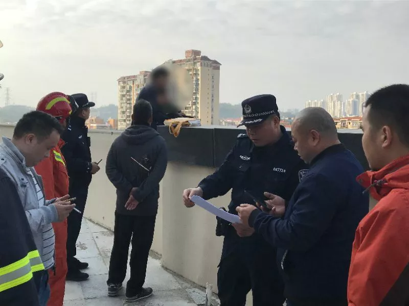 隨后,公安、消防等多部門很快趕到現(xiàn)場。大家兵分幾路,一路是消防救援人員,立即在一樓鋪設(shè)了救援氣墊,另一路是民警,對男子進行現(xiàn)場勸說。