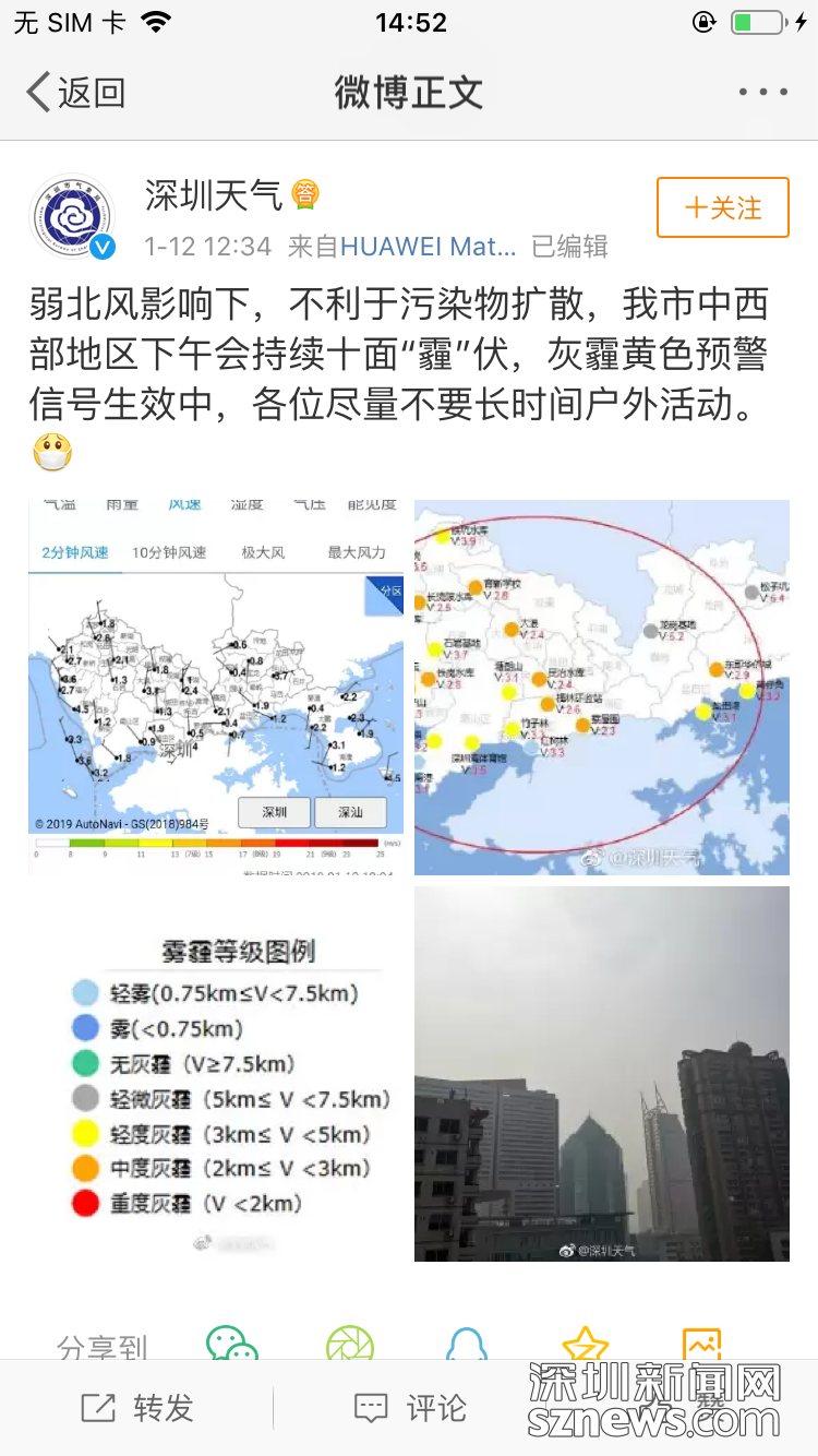 1月12日中午,深圳天氣微博發(fā)布預(yù)警,圖中橙色圓點(diǎn)所在的深圳多個片區(qū)發(fā)生中度灰霾