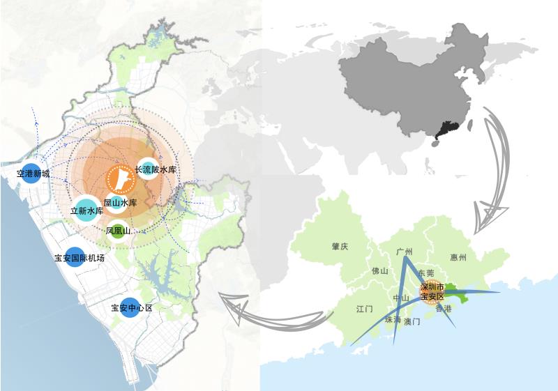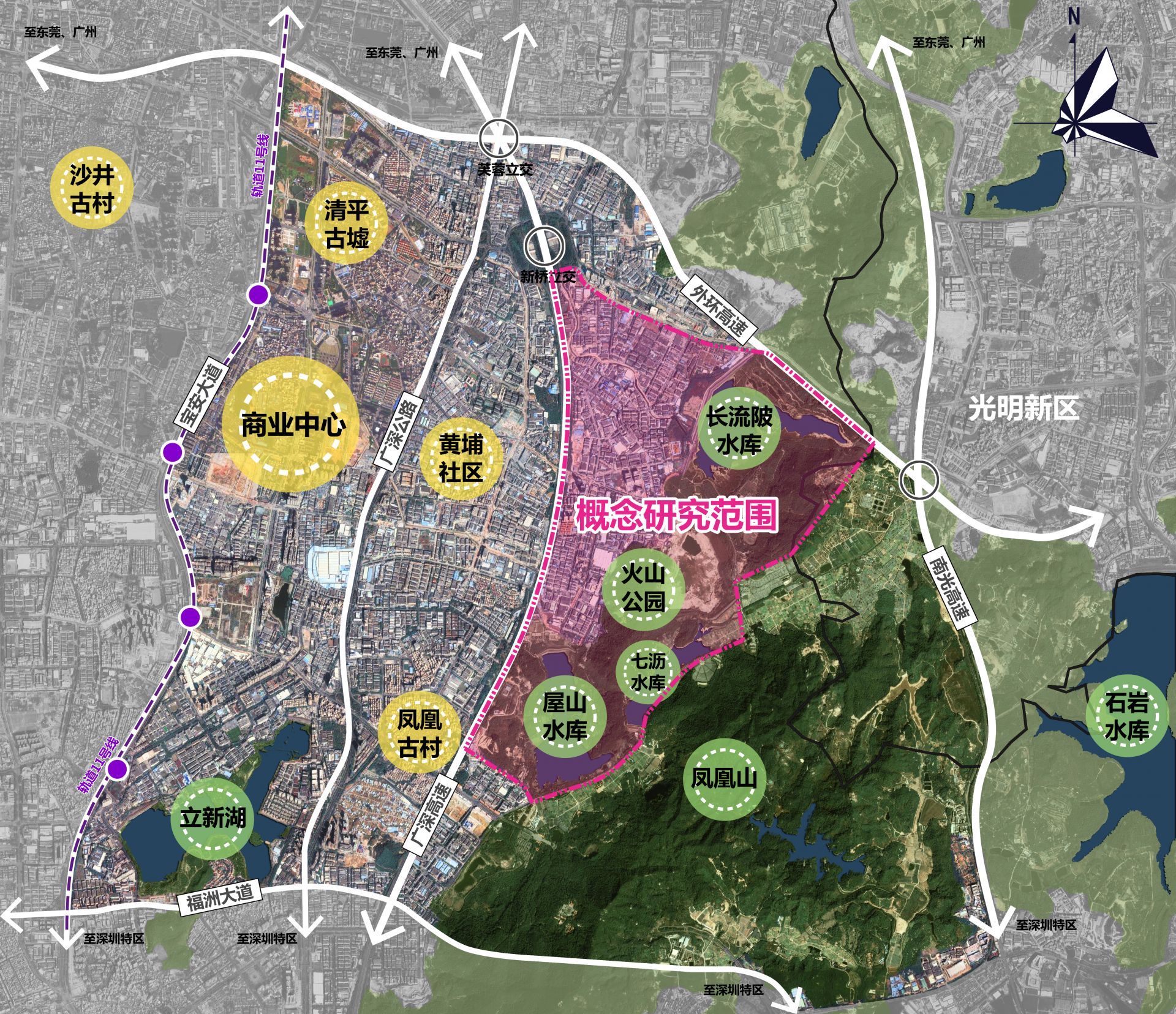 概念規(guī)劃范圍包含詳細設計范圍在內的周圍關聯緊密地區(qū),用地約10平方公里,北至新玉路和外環(huán)高速,西至廣深高速,南至鳳凰第二工業(yè)區(qū),東部為包含“三庫一園”(屋山水庫、長流陂水庫、七瀝水庫及火山公園)在內關聯緊密的自然山體、水等要素。