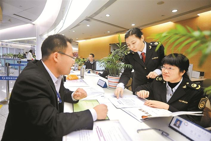深圳在商事登記改革中推出“30證合一”信息共享模式,市民辦事更加便利。圖為市行政服務(wù)大廳工作人員熱情為市民服務(wù)。深圳特區(qū)報(bào)記者何龍攝
