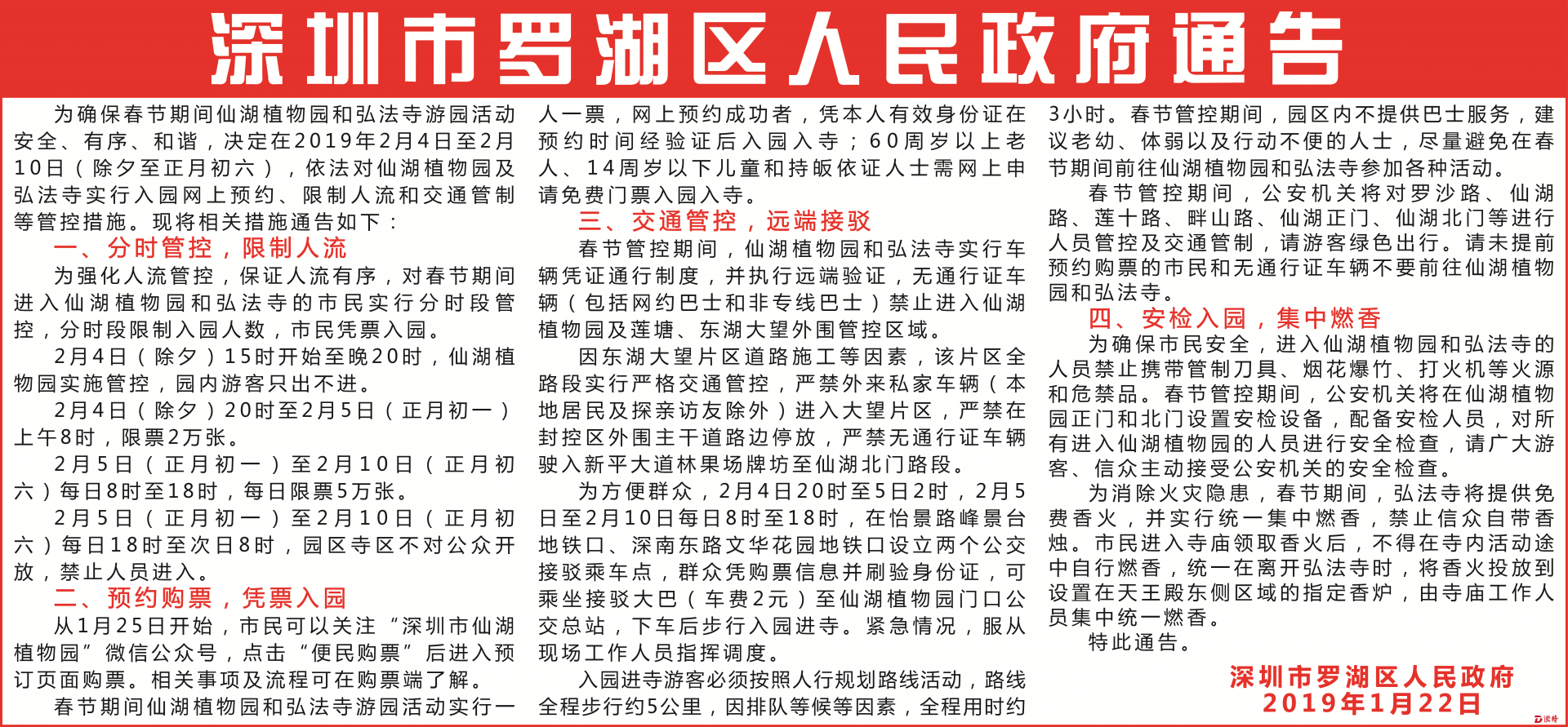 為確保春節(jié)期間仙湖植物園和弘法寺游園活動(dòng)安全、有序、和諧,決定在2019年2月4日至2月10日(除夕至正月初六),依法對(duì)仙湖植物園及弘法寺實(shí)行入園網(wǎng)上預(yù)約、限制人流和交通管制等管控措施?,F(xiàn)將相關(guān)措施通告如下: