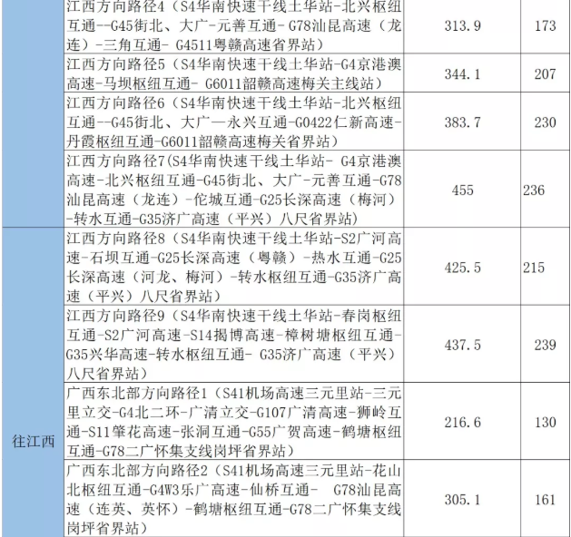 從廣州出發(fā),通往湖南、廣西東北部、江西、福建、廣西北部灣及海南方向的出行指引: