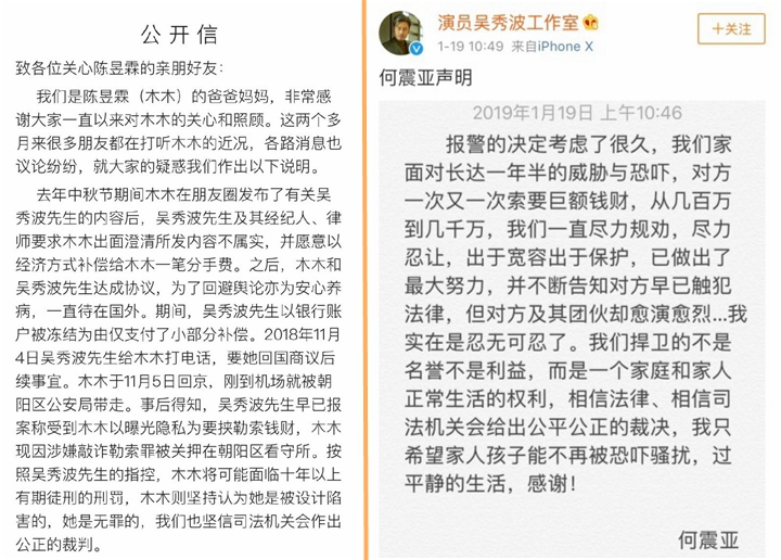 深圳新聞網(wǎng)1月22日訊(記者 張玲)近日,演員吳秀波婚內(nèi)出軌事件再度發(fā)酵在微博引發(fā)熱搜,而這次事件的主角則是之前銷聲匿跡已久的陳昱霖(藝名)。2019年1月18日,陳昱霖父母微博公開(kāi)發(fā)表聲明稱女兒被吳秀波欺騙回國(guó)后,吳秀波以“曝光隱私威脅勒索錢財(cái)”為由報(bào)警,女兒在下飛機(jī)后即被警方抓捕。隨后,吳秀波妻子何震亞發(fā)表聲明反擊,稱陳昱霖多次威脅索要巨額財(cái)務(wù),數(shù)額一度高達(dá)千萬(wàn),在忍無(wú)可忍的情況下才選擇報(bào)警,希望通過(guò)司法途徑維護(hù)自己的權(quán)益。