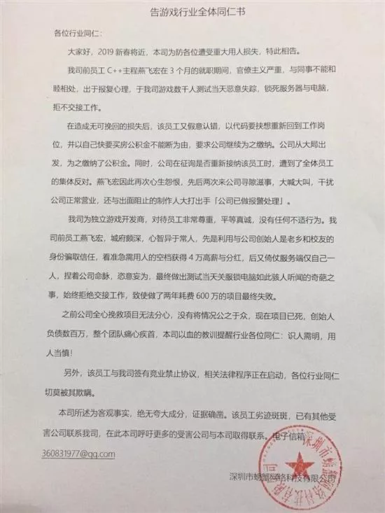 1月20日,深圳市螃蟹網(wǎng)絡(luò)科技有限公司創(chuàng)始人尹柏霖發(fā)文控訴,前員工燕某在游戲上線測(cè)試當(dāng)天(2017年12月15日),鎖死服務(wù)器與電腦,并惡意失蹤,致公司損失慘重。尹柏霖稱,“我們上線不了也測(cè)試不了,等新員工到職后熟悉新代碼又是幾個(gè)月過(guò)去了。”