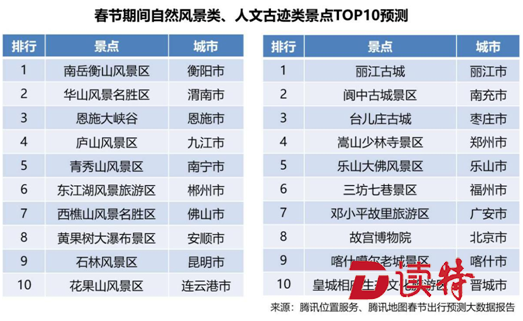 除了返鄉(xiāng)外,春節(jié)同樣是外出旅游的好時(shí)機(jī)。據(jù)《報(bào)告》預(yù)測(cè),在全國(guó)259家5A級(jí)旅游景點(diǎn)中,南岳衡山風(fēng)景區(qū)、華山風(fēng)景名勝區(qū)、恩施大峽谷將排名最火爆自然風(fēng)景類景區(qū)前三,麗江古城、閬中古城景區(qū)、臺(tái)兒莊古城則是最具人氣的人文古跡類景區(qū)前三。