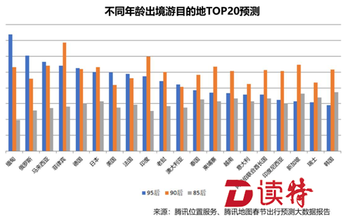 根據(jù)年齡劃分,18歲以下青少年最喜歡前往東南亞國(guó)家,而60歲以上老年人最青睞的是歐美發(fā)達(dá)國(guó)家。進(jìn)一步研究發(fā)現(xiàn),85后最愛去的國(guó)家是韓國(guó)、新加坡、瑞士、阿聯(lián)酋、越南,涵蓋東亞、東南亞和歐洲,90后最愛去的國(guó)家是菲律賓、印度、新加坡、馬來西亞、柬埔寨,全部在東南亞地區(qū),95后最愛去的國(guó)家是緬甸、俄羅斯、馬來西亞、菲律賓、德國(guó),涵蓋東南亞和歐洲。