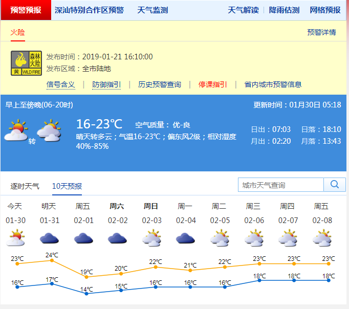 深圳新聞網(wǎng)2019年1月30日訊 深圳今日天氣多云,氣溫16-23℃,東風2-3級,相對濕度40%-80% ;31日多云轉(zhuǎn)陰天,偶有零星小雨;2月1日受冷空氣影響,有分散小雨,沿海和高地最大陣風7級,氣溫下降,天氣轉(zhuǎn)涼;2-3日多云,早晚有輕霧,氣溫上升;4-5日陰天間多云,有輕霧和短時小雨。