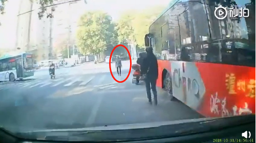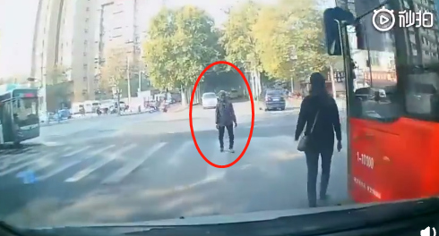 老太太走到小車(chē)正前方時(shí)卻突然停下腳步,緊接著緩緩臥倒在地。
