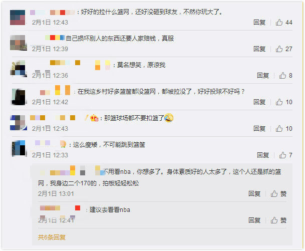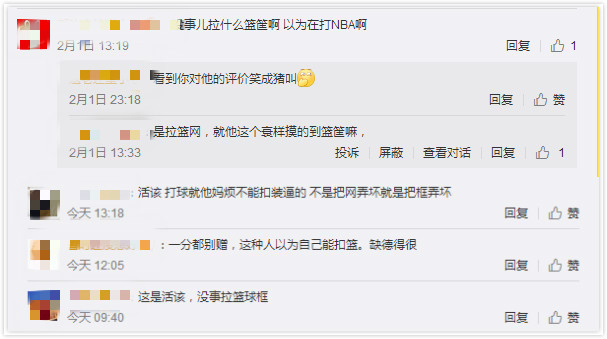 還有一些網(wǎng)友借機表達了自己對某類人的"墻裂"不滿!"沒事兒拉什么球框啊,以為在打 NBA啊""活該,打球就煩不能扣還裝 X的"......