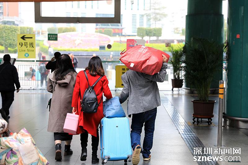 在深圳火車站,一名旅客扛著行李從出站口走出