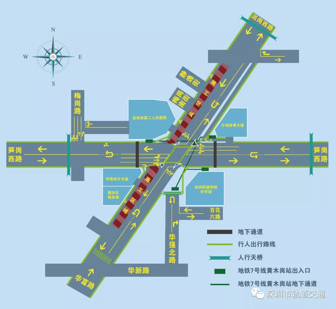 1.黃木崗立交橋拆除后,地面恢復(fù)成平交燈控十字路口,筍崗西路、華富路、泥崗西路實現(xiàn)雙向六車道通行,華強北路繼續(xù)中斷。