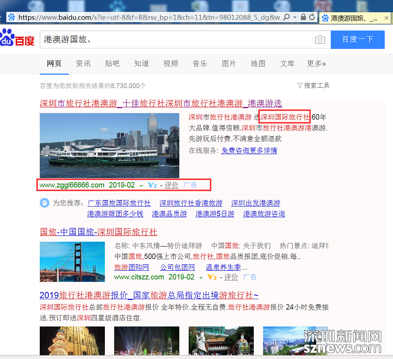 深圳市消委會(huì)模擬消費(fèi)者網(wǎng)絡(luò)搜索實(shí)際使用場景,在百度搜索中搜索“港澳游國旅”等關(guān)鍵詞,進(jìn)行了專項(xiàng)測試調(diào)查。調(diào)查發(fā)現(xiàn),搜素“港澳游國旅”等關(guān)鍵詞時(shí)搜索頁面會(huì)出現(xiàn)加V等級(jí)認(rèn)證的旅行社廣告信息,但經(jīng)核實(shí),“深圳信用網(wǎng)”商事主體登記信息中并無該企業(yè)。