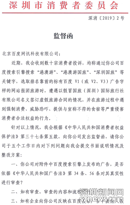 “野馬”旅行社屢禁不絕、愈演愈烈,不僅嚴(yán)重傷害了廣大消費(fèi)者,傷害了合法企業(yè)的正當(dāng)經(jīng)營,傷害了公平有序的市場競爭秩序,也傷害了深圳的城市形象,這其中,百度難辭其咎。一些不法分子利用百度信譽(yù)V認(rèn)證的核查漏洞和競價(jià)排名規(guī)則,把百度作為招徠客源的廣告投放平臺(tái),對(duì)消費(fèi)者起到了極強(qiáng)的誤導(dǎo)作用。在此,深圳市消委會(huì)“三問百度”: