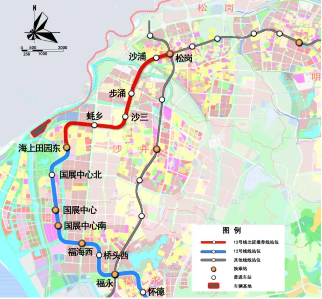 12號(hào)線(xiàn)北延線(xiàn)由在建地鐵12號(hào)線(xiàn)海上田園東站后,至沙江路與寶安大道交叉口前設(shè)置松崗站,與在建地鐵6號(hào)線(xiàn)和既有地鐵11號(hào)線(xiàn)換乘。全長(zhǎng)約8.2公里,采用地下敷設(shè)。