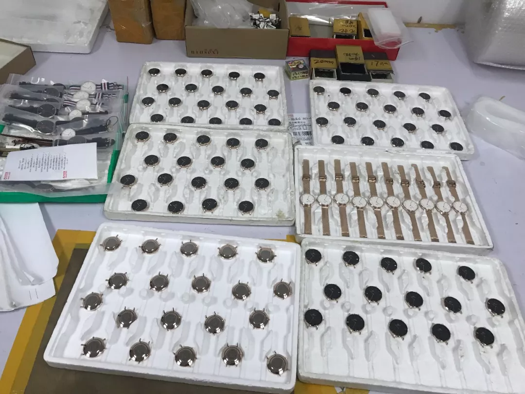 2018年6月21日,深圳市公安局經(jīng)偵支隊(duì)聯(lián)合市市場(chǎng)監(jiān)管部門開展打擊假冒DW品牌手表、FOREO等品牌潔面儀收網(wǎng)行動(dòng),共出動(dòng)警力110人,查處窩點(diǎn)13個(gè),刑拘犯罪嫌疑人12人。現(xiàn)場(chǎng)查扣假冒DW品牌手表13500塊,表帶、表殼、后蓋等配件43000個(gè)以及包裝盒、標(biāo)簽12000余個(gè),現(xiàn)場(chǎng)查扣假冒產(chǎn)品價(jià)值1200萬元人民幣,總涉案金額3000余萬元人民幣。查扣假冒各品牌美容產(chǎn)品、半成品和商標(biāo)標(biāo)識(shí)11798件,查扣假冒產(chǎn)品價(jià)值人民幣500萬元。經(jīng)查,上述犯罪團(tuán)伙在未經(jīng)注冊(cè)商標(biāo)所有人許可的情況下,擅自使用注冊(cè)的商標(biāo)圖案組裝、翻新假冒DW品牌手表、FOREO品牌潔面儀。經(jīng)商標(biāo)權(quán)利人鑒定,現(xiàn)場(chǎng)查獲的手表和美容儀為假冒其注冊(cè)商標(biāo)的產(chǎn)品。