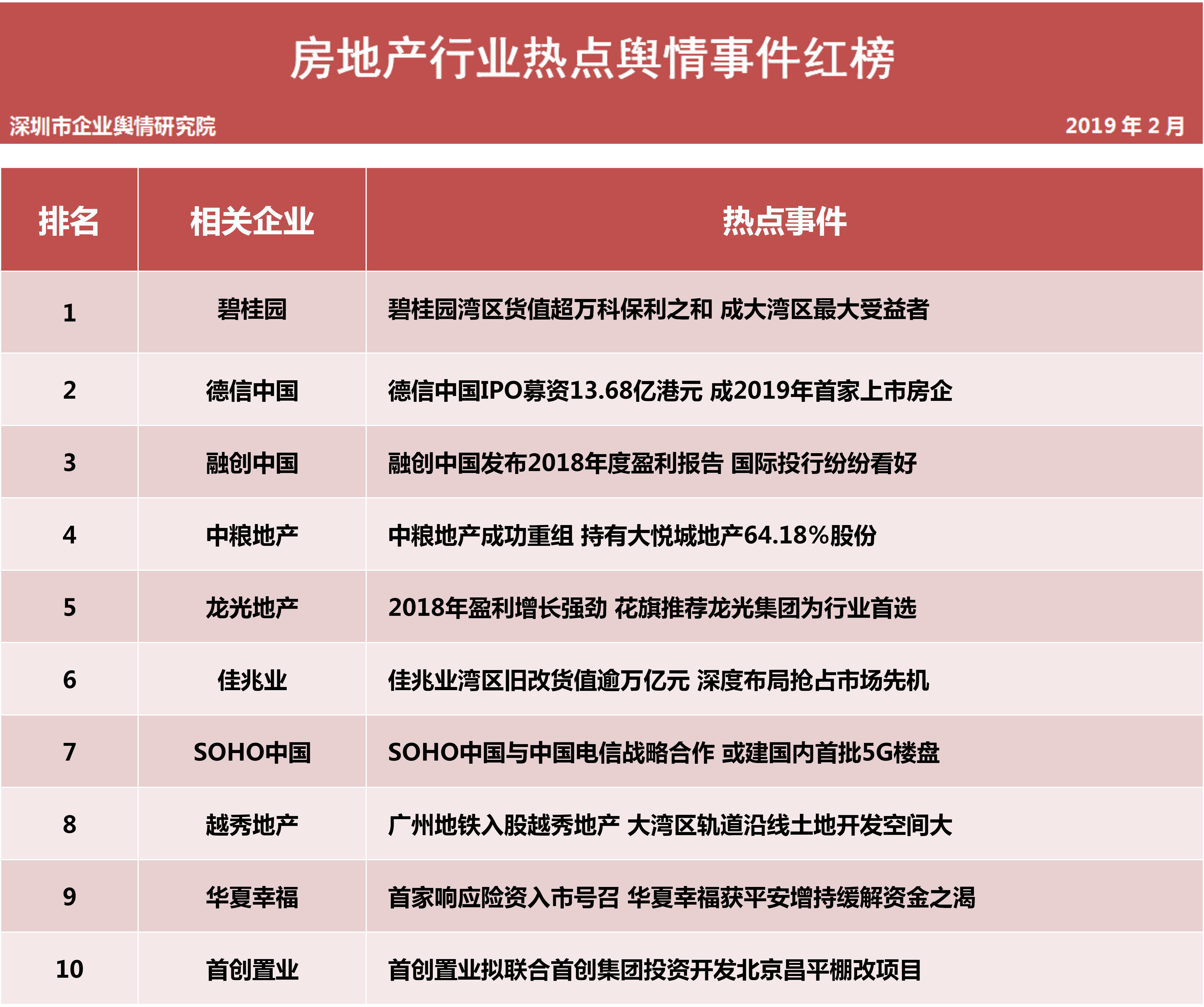 深圳新聞網(wǎng)2019年3月5日訊 (記者田志強(qiáng) 通訊員陳文光)3月5日,深圳企業(yè)輿情研究院發(fā)布第十三批企業(yè)輿情榜單。本次榜單重點(diǎn)聚焦房地產(chǎn)及醫(yī)藥保健兩個(gè)行業(yè)。房地產(chǎn)行業(yè)企業(yè)輿情榜單由房地產(chǎn)行業(yè)熱點(diǎn)輿情事件排行榜(紅、黑榜)及房地產(chǎn)企業(yè)公眾形象排行榜組成。
