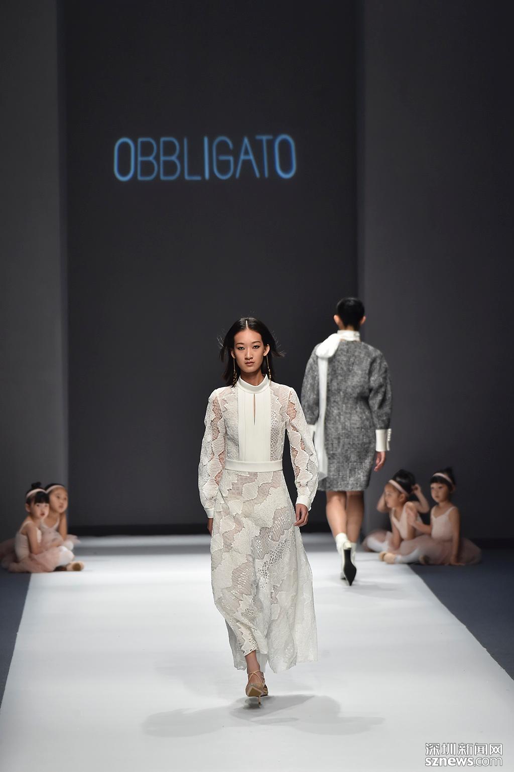 品牌OBBLIGATO展示環(huán)節(jié),參展的一位小孩子望向正在走臺的模特