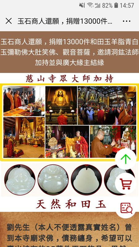 記者打開警方提供的網(wǎng)站鏈接,隨即便出現(xiàn)了香港某知名寺院的頁面,上面有不同的法師主持不同法事的照片。照片上方,赫然寫著"玉石商人還愿,捐贈13000件和田玉羊脂青白玉彌勒佛大肚笑佛、觀音菩薩,邀請 XX法師加持并與廣大緣主結(jié)緣"的字樣。接下來網(wǎng)頁上便講述了一個(gè)漏洞百出、文理不通的"傳奇故事"——