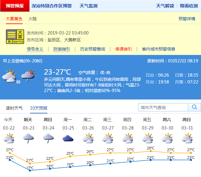 深圳新聞網(wǎng)2019年3月22日訊 記者從深圳市氣象局獲悉,今日白天轉陣雨或雷雨,局部可達大雨,并可能伴有7-8級短時大風;23-24日云量較多伴有小雨,氣溫下降5-6℃,天氣轉涼;25日轉多云,氣溫回升。