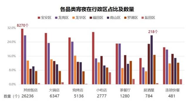 各品類宵夜在7個(gè)行政區(qū)占比及數(shù)量