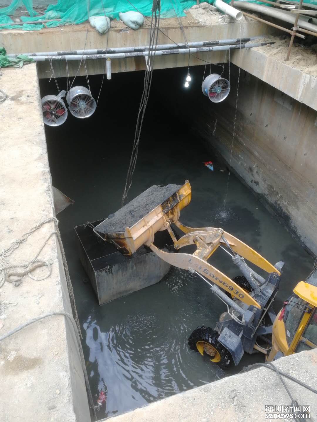 作為整個項目兩處開口之一,皇崗中學(xué)旁這片工地只有400平方米,很多大型設(shè)備無法施展開來。記者在現(xiàn)場看到,厚重的淤泥堆積有半人高,可見地下淤積情況嚴(yán)重,但現(xiàn)場堆積的淤泥并沒有令人窒息的味道,現(xiàn)場通風(fēng)工作較為不錯。走近施工口記者發(fā)現(xiàn),多臺送風(fēng)機(jī)在不停歇地工作,抽水設(shè)施也在將暗渠的水抽出,確保渠內(nèi)積水在安全工作線內(nèi)。
