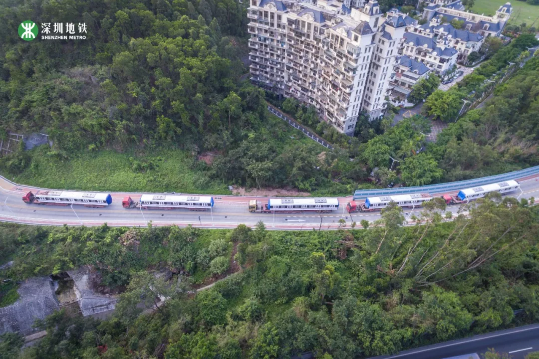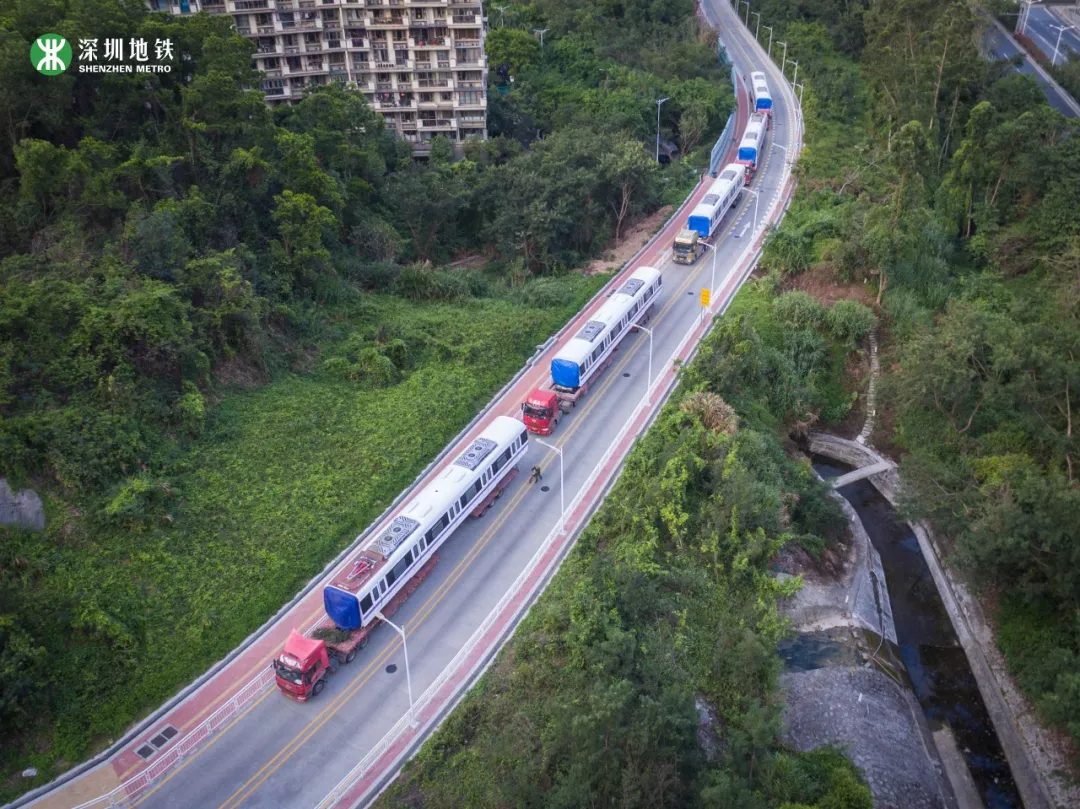 列車“乘坐”平板卡車從中車株機(jī)廠起運(yùn),經(jīng)過近1000公里的鐵公路運(yùn)輸,最后抵達(dá)深圳深云車輛段。