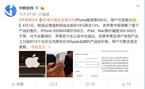 蘋果中國全系降價:iPhone最高降500元,用戶可退差價。4月1日,蘋果中國調整了旗下產品的售價相關話題也沖上熱搜第一。