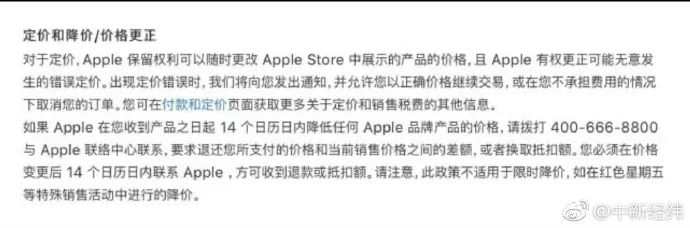 蘋果官方在公告中也指出,如果蘋果在用戶收到產品之日起的14個日歷日內降低任何 Apple品牌的產品價格,用戶可要求退還差額。