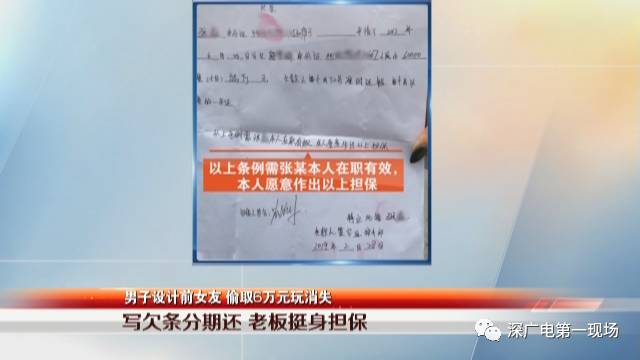 這張2019年2月28日立下的欠條上面寫著,張某欠郭小姐6萬元,欠款人張某每個月30號準(zhǔn)時還錢,以工資的一半還。欠條上,留有張某及郭小姐兩人的簽字和身份證號,張某還按了手印。而欠條中央有一行字“以上條例需張某本人在職有效,本人愿意作出以上擔(dān)?!薄?dān)保人處簽名很潦草,郭小姐說,是張某的老板黃某某簽的。