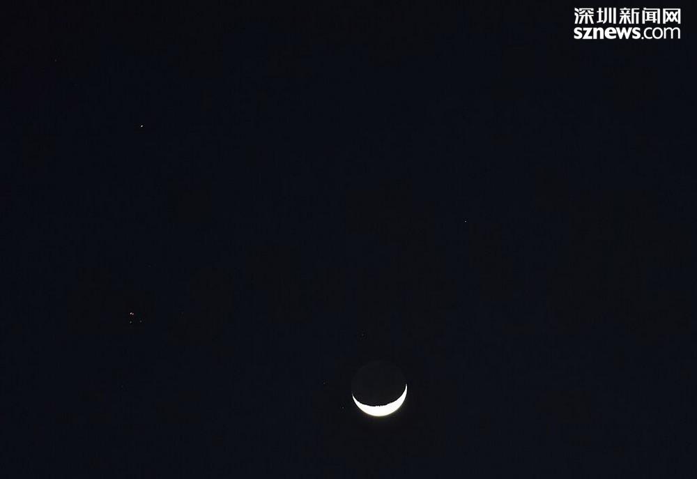 深圳新聞網(wǎng)2019年4月10日訊(記者 楊浩翰)相信不少市民朋友聽(tīng)過(guò)“木星伴月”和“金星伴月”的概念。4月9日是農(nóng)歷初五,深圳的夜空中就出現(xiàn)了“雙星伴月”的天體現(xiàn)象。因?yàn)闄C(jī)緣巧合,昨晚彎彎的月亮從亮恒星畢宿五和火星中間路過(guò),三者相聚在一起,就出現(xiàn)了“月亮笑臉”。