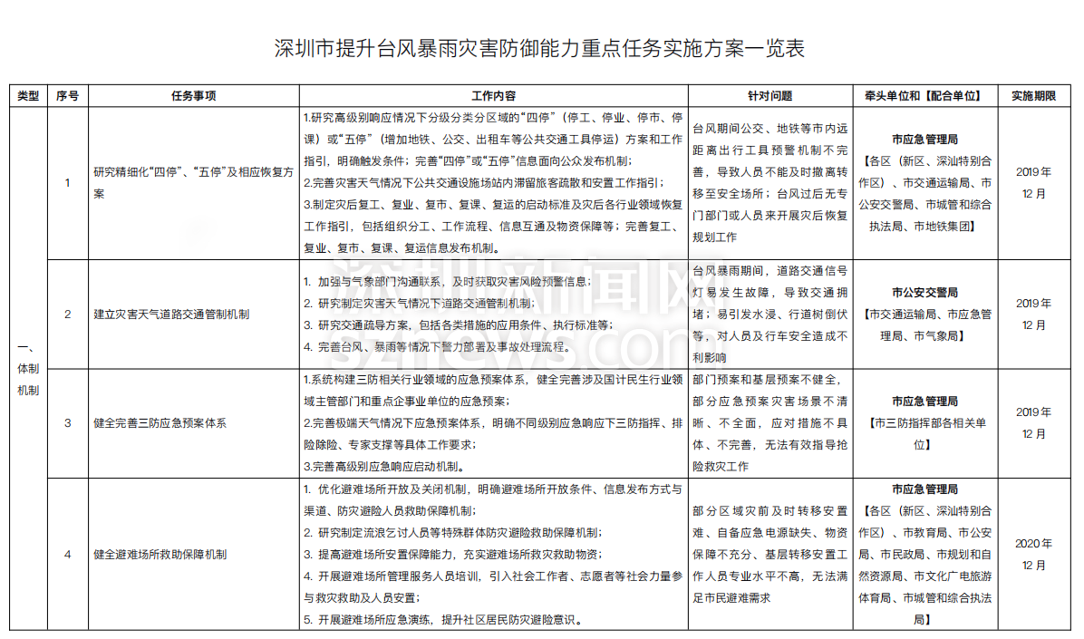 附:《深圳市提升臺(tái)風(fēng)暴雨災(zāi)害防御能力重點(diǎn)任務(wù)實(shí)施方案一覽表》