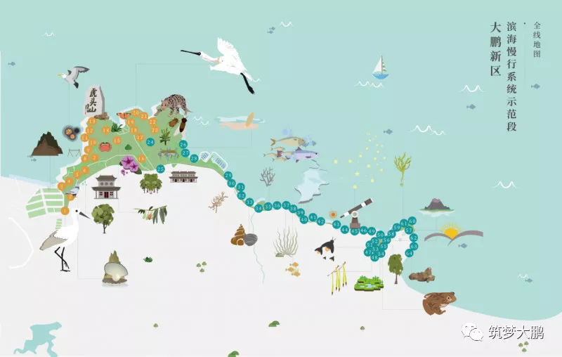 大鵬新區(qū)根據(jù)線路的地形、山海景觀、人文景觀的分布,確定了“打造‘兩線、三段、五大節(jié)點’的濱海生態(tài)自然課堂步道”。據(jù)新區(qū)建筑工務(wù)局負(fù)責(zé)人介紹,從新大河入??诘酱髞啚澈0堵咕讘已?,全長18.7公里的海岸線上分布著河流、山林、海灘、溪流、濕地等多樣生態(tài)系統(tǒng)。2017年7月,大鵬新區(qū)按照濱海慢行系統(tǒng)示范工程標(biāo)準(zhǔn),動工建設(shè)新大-鹿嘴市政綠道?!皟删€”指的是沿著海岸的濱海徒步路線和城市二號綠道線,兩條線之間的6.6平方公里土地將形成一座開放的郊野公園;“三段”分別為活力生活段、自然生態(tài)段和休閑旅游段;“五大節(jié)點”為山海綠畔、古廟遺風(fēng)、東山凹、愛情灘、鹿咀山莊等自然景觀。